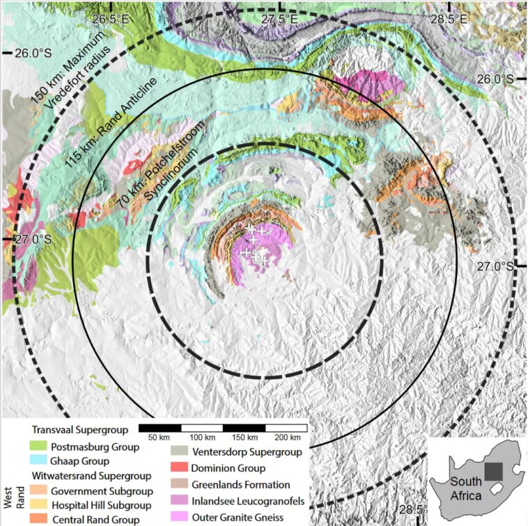 Pour le savoir, les chercheurs ont creusé l’une des plus anciennes structures d’impact connues de la planète : le cratère de Vredefort en Afrique du Sud. La structure mesure environ 300 kilomètres (186 miles) de diamètre et s’est formée il y a environ 2 milliards d’années lorsqu’un impacteur d’environ 20 kilomètres (12,4 miles) de diamètre a percuté la planète.