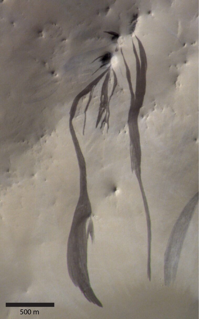 Au lieu de cela, l'étude a révélé que les deux caractéristiques sont plus susceptibles de se former par endroits avec une vitesse de vent supérieure à la moyenne et un dépôt de poussière – des facteurs qui pointent vers une origine sèche.