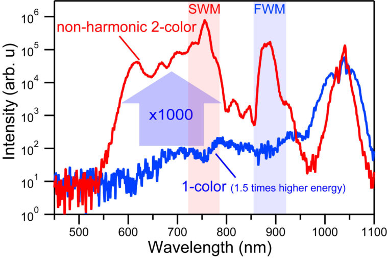 L’équipe a utilisé une excitation laser femtoseconde bicolore non harmonique, dans laquelle les deux longueurs d’onde laser ne partagent pas un rapport de fréquence entier. Alors que les combinaisons harmoniques (telles que la lumière fondamentale et la lumière de deuxième harmonique) sont largement utilisées en optique non linéaire, il s'agit de la première démonstration que l'excitation non harmonique dans l'eau peut débloquer un puissant régime d'interaction lumière-matière.