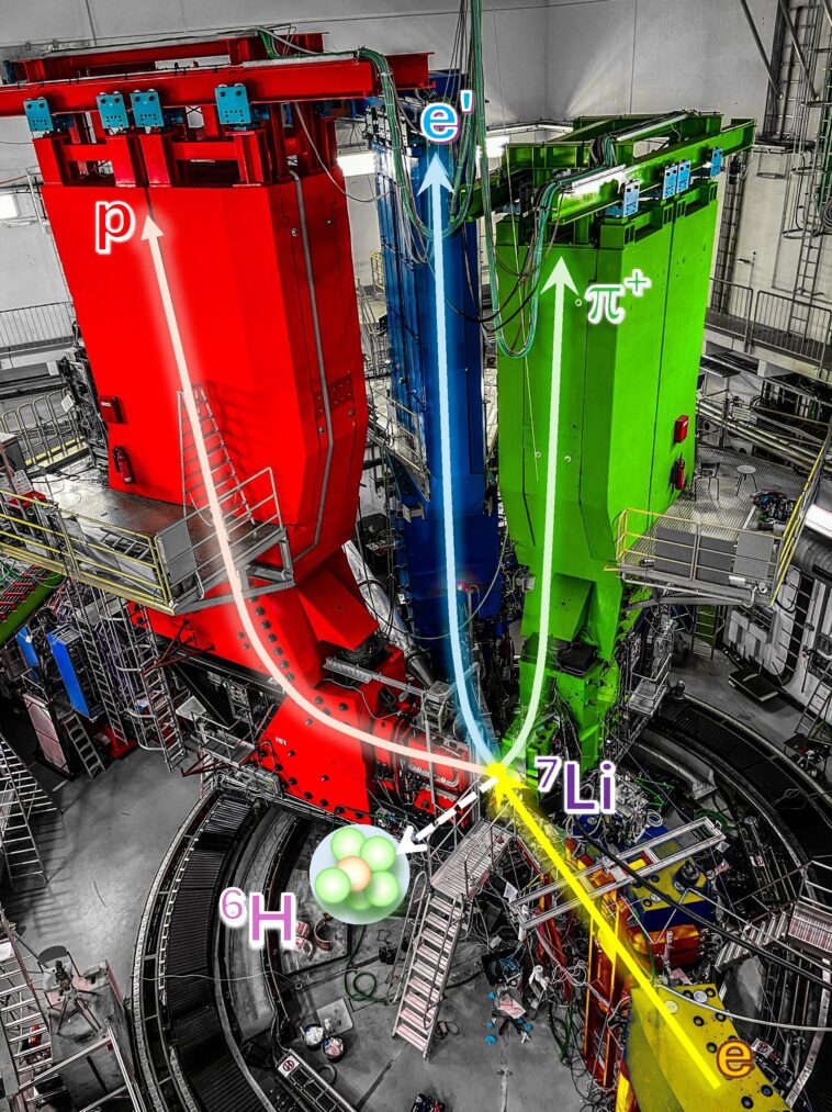 Avec les scientifiques chinois et japonais impliqués, la collaboration A1 a développé une nouvelle approche pour produire ⁶h. Dans cette méthode, un faisceau d'électrons avec une énergie de 855 mégaelectronvolts (MEV) impose sur une cible ⁷li, produisant ⁶h via un processus en deux étapes: d'abord, un proton dans le noyau lithium est excité par l'interaction avec l'électron et se désintègre rapidement dans un neutron et un pion chargé positivement.