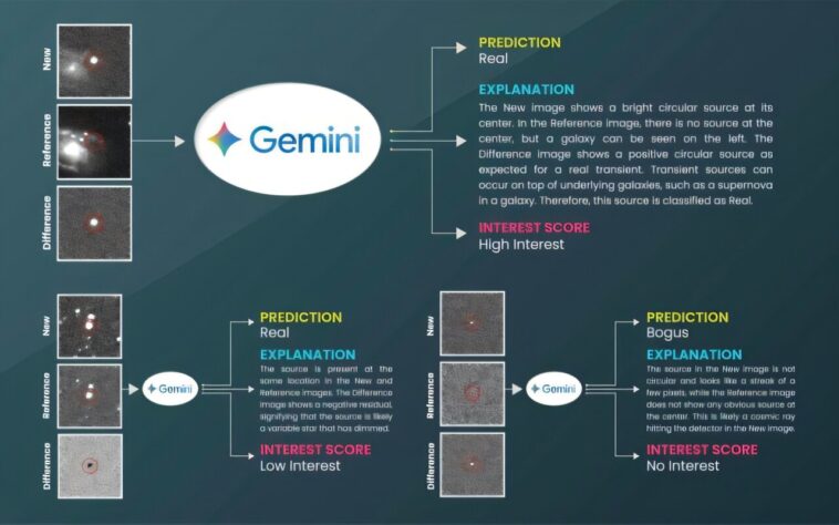 Les chercheurs ont utilisé des invites spécifiques pour Gemini pour analyser 15 exemples avec des instructions pour les classer comme « Aucun intérêt », « Faible intérêt » et « Intérêt élevé » pour les artefacts célestes, les étoiles variables et les événements explosifs, respectivement, avec le référentiel complet d'exemples, d'invites et d'instructions téléchargés sur GitHub. Les chercheurs ont ensuite mené une analyse de suivi six mois plus tard, Gemini ayant été mis à jour avec de nouveaux algorithmes. En fin de compte, les chercheurs ont constaté que Gemini avait atteint une précision pour ATLAS, MeerLICHT et Pan-STARRS de 91,9 %, 93,4 % et 94,1 %, respectivement.
